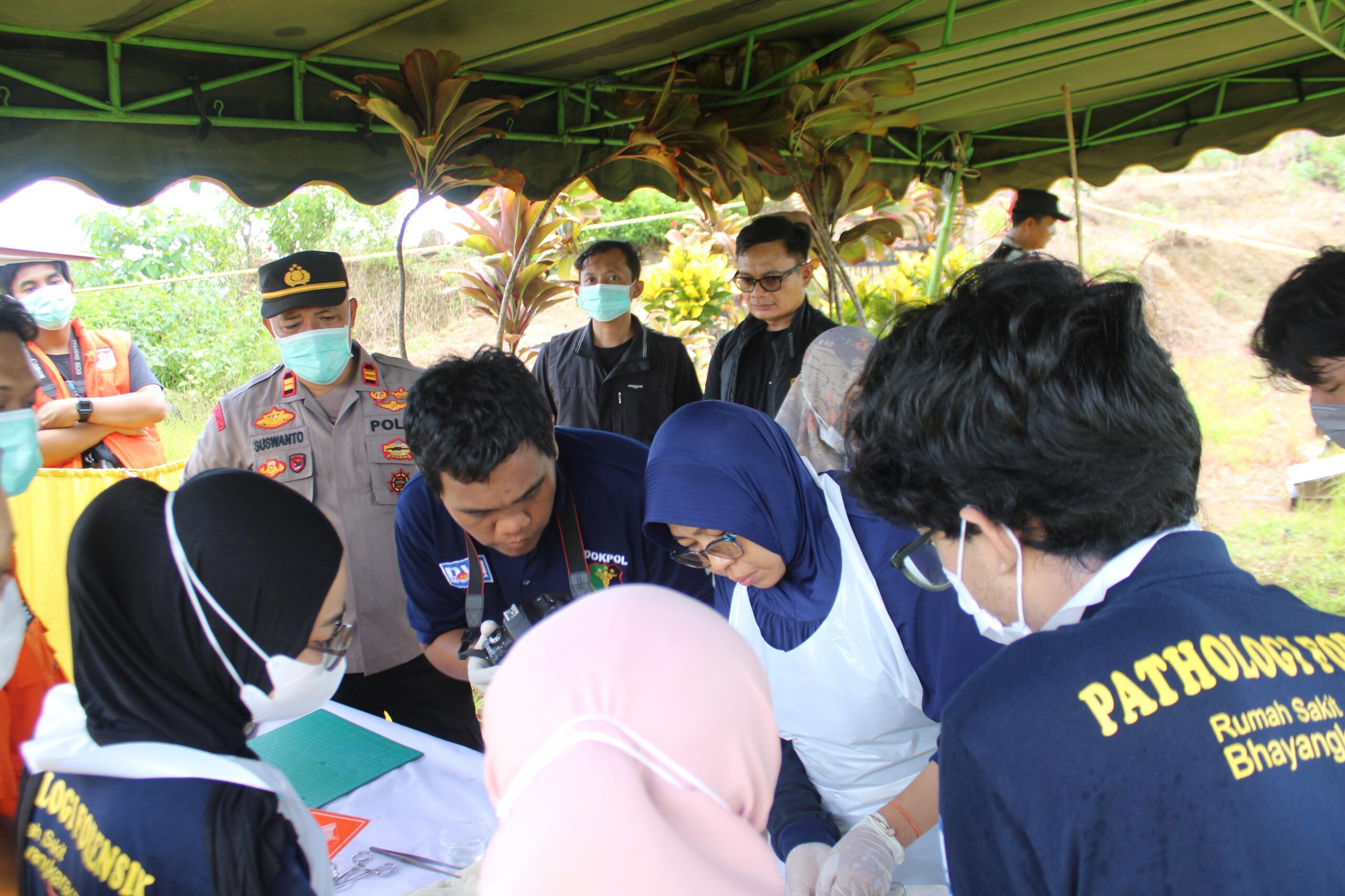 Proses otopsi terhadap bayi Mr. X dilakukan tim forensik RS Bhayangkara Kediri di lokasi pemakaman Desa Terbis, disaksikan jajaran kepolisian dan perangkat desa.